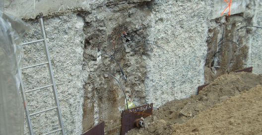 “Building B” (part of the project), with an underlying basement was constructed between two adjacent structures. B&P Bodeminjectie B.V. applied a vertical injection body using soil injection with water-glass hardener was applied under the 2 adjacent structures to reinforce their concrete pipes as foundations. The activities were carried out in several phases due to the anchoring of the injection body. The wall height was almost 8 metres high in some parts.